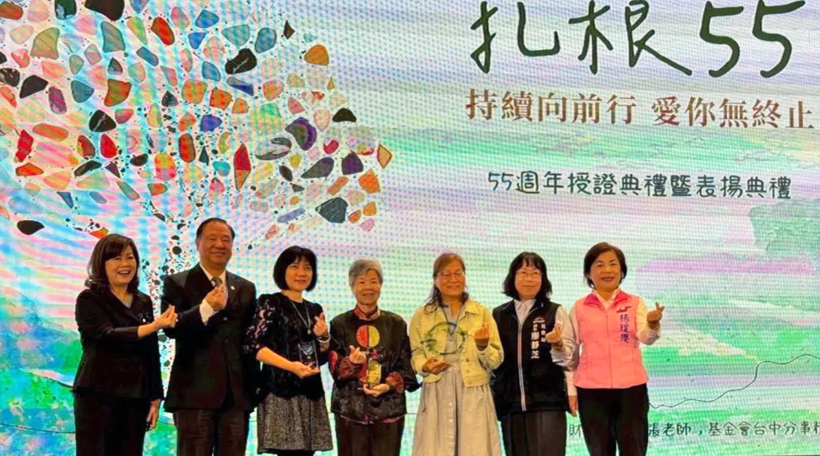 Director Liao Ching-chih (second from right) of the Taichung City Social Affairs Bureau, Chairperson Chang Lily (first from left), Chairman Ge Yung-kuang (second from left), Legislator Yang Chiung-ying (first from right), and award recipient Zhang. (Photo provided by Teacher Chang from Taichung)